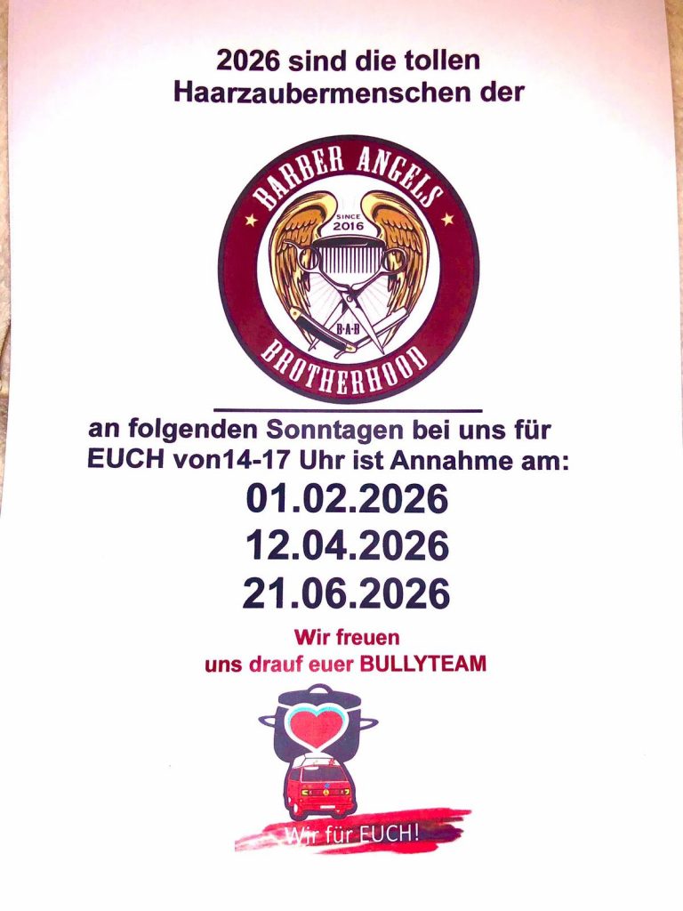 Unten findet ihr die nächsten Termine der Barber Angels in der Bully Ecke. Kommt vorbei!