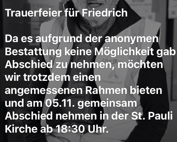 Wir trauern um Inge. Inge war die Königin der Reeperbahn und darf nicht einfach so verschwinden. Genauso wenig wie jeder andere bedürftige Mensch in Hamburgs Straßen. Wir wollen Sichtbarkeit schaffen am 30.04.2025 mithilfe des Bettlermarsches über die Reeperbahn. Helft uns dabei zu helfen. Lasst uns gemeinsam allen obdachlosen Menschen gedenken, die ihr Leben auf Hamburgs Straßen verloren haben. Herzlichen Dank und wir sehen uns nächste Woche.
