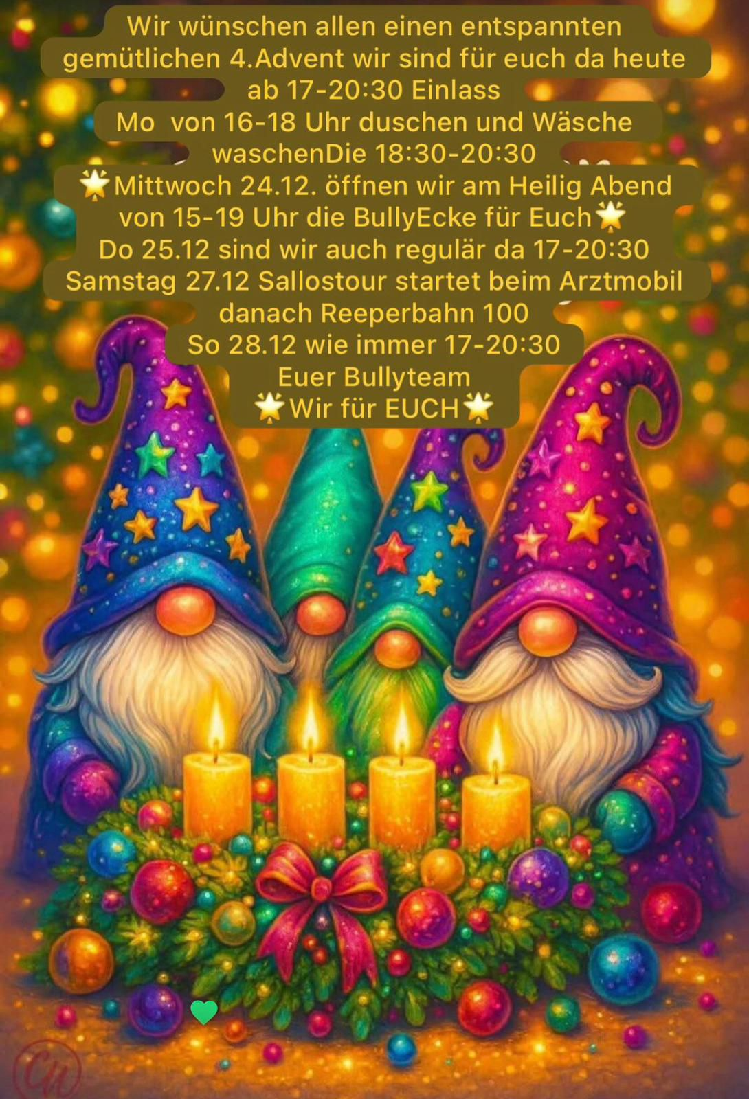Die Zähne vieler Obdachloser sind in einem katastrophalen Zustand. Wer deshalb dieses Mal nicht den Mut aufbringen konnte sich zähnärztlich behandeln zu lassen, kann bald den nächsten Anlauf wagen: Die aktuellen Termine der mobilen Zahnarztpraxis sind auf der Seite des DRK Kreisverbandes Altona und Mitte zu finden. Der nächste Termin bei der Bully❤Ecke ist am 21.05.2024 von 19:30 Uhr bis 21:00 Uhr.